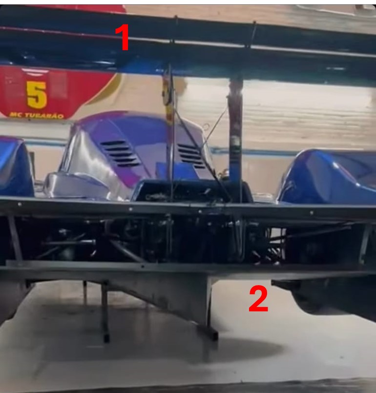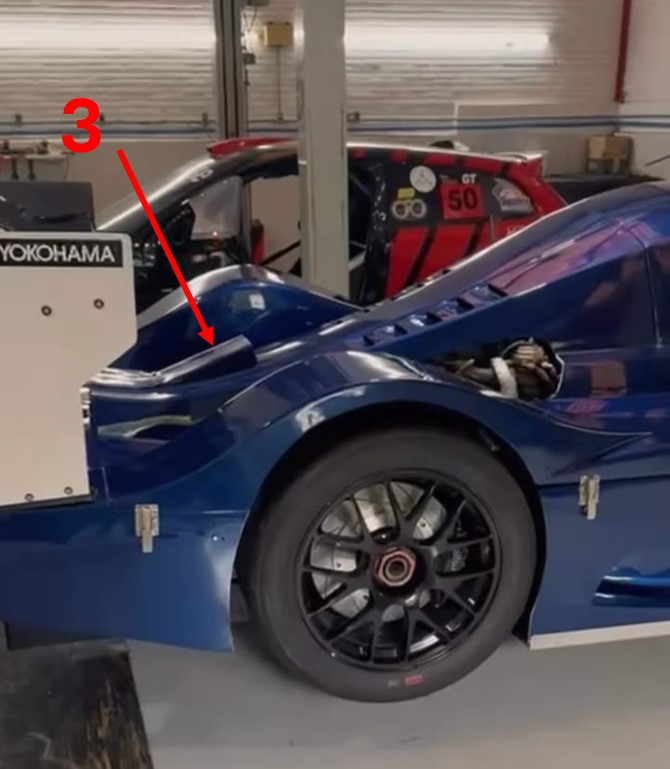Poucas imagens foram reveladas, porém podemos perceber o aerofólio traseiro com duplo elemento (1) e o generoso difusor traseiro (2) enquanto a lateral segue praticamente inalterada em relação ao design do MR18, com as maiores diferença sendo as ausências da tomada de ar sobre o teto do carro e da barbatana dorsal. Na traseira também é possível perceber uma tomada de ar bem recuada, provavelmente para algum radiador de óleo localizado nessa região.