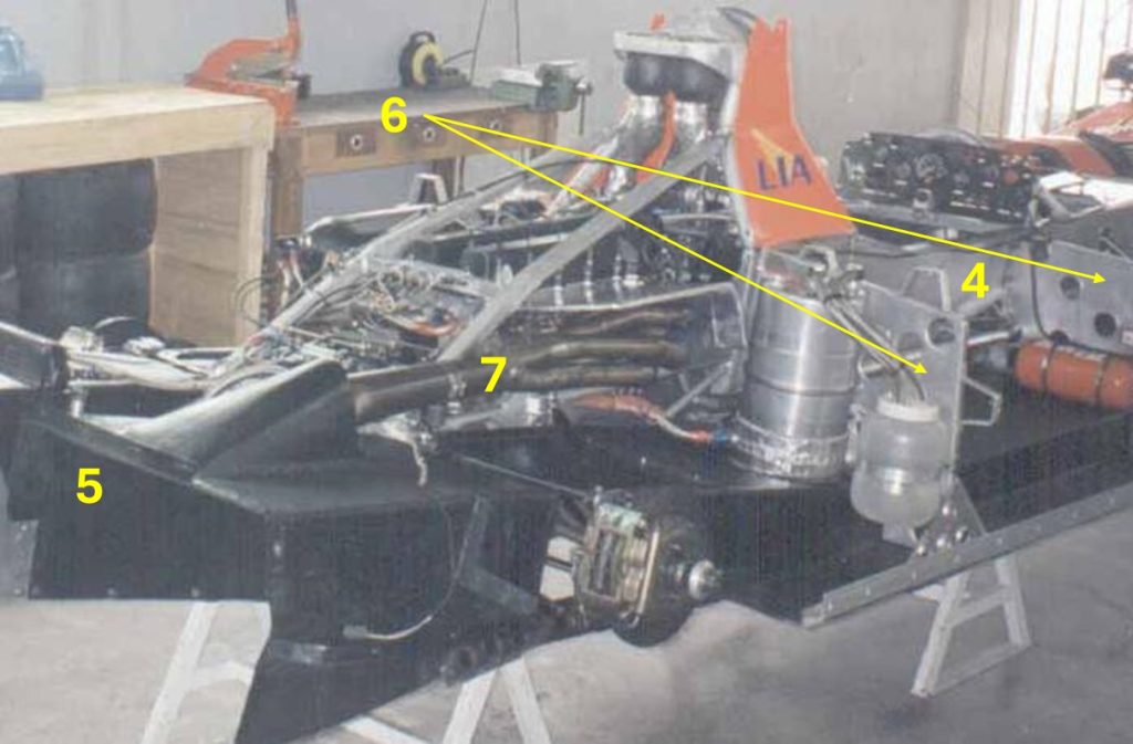 Além disso, é dessa época uma das poucas imagens disponíveis do chassi, onde podemos ver o monocoque em alumínio (4) com os túneis sob o assoalho (5) e os suportes laterais que servem para a montagem da carroceira e elementos auxiliares (6). Interessante notar também o coletor de descarga estilo 4×1 com saída para a zona de expansão do difusor traseiro (7) – não é claro se esse posicionamento tinha intenção de ajudar a energizar o fluxo de ar ou se somente era o posicionamento mais conveniente.