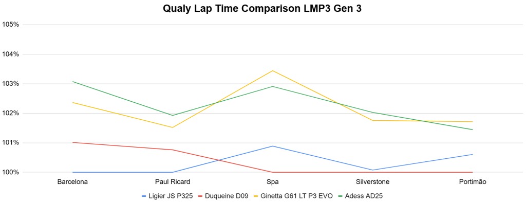 | Ginetta G61 LT P3 EVO | 102,16% | 102,36% | 101,52% | N/A | 103,44% | 101,76% | 101,72% |